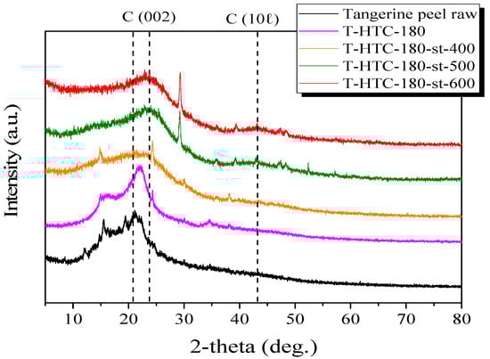 Figure 4 presents the XRD patterns of carbon materials that secondary dry carbonization (DC) at 400, 500, and 600 °C after HTC treatment. It is seen that the pattern is significantly different from the T-HTC-180 sample that underwent only the HTC process, indicating an XRD pattern of amorphous carbon. As the carbonization temperature increased, the full width at half maximum (FWHM) of the relatively broad (002) peak decreased. From the results, the amorphous structure of biochar is inversely proportional to the carbonization temperature.