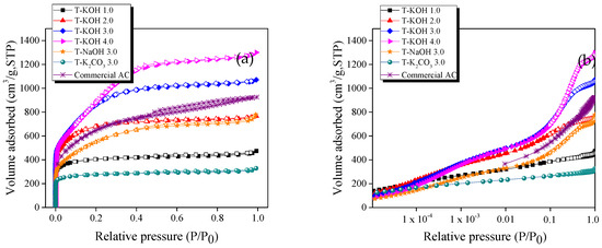 N2/77 K isotherm adsorption–desorption curves of T-AC as a function of various activation conditions; (a) normal, (b) logarithmic at relative high pressure.