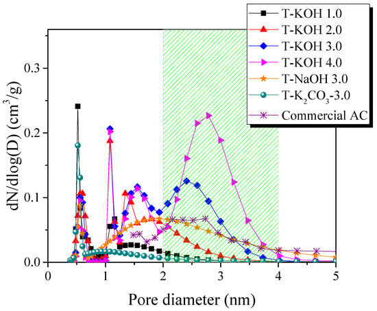 The specific pore region developed in T-KOH-AC produced in this study corresponds to the sub-mesopore (1.5–4.0 nm) region, which previous studies have reported to improve pore selectivity for specific gases (e.g., n-butane) [31].