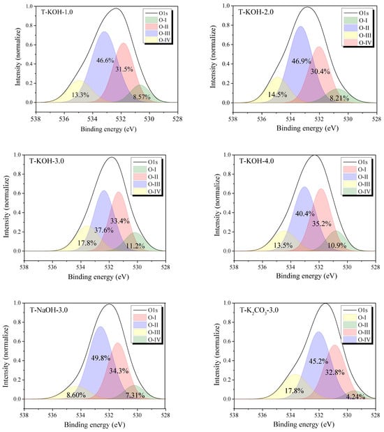 The concentration of O1s determined via XPS exhibits a declining trend as the proportion of the KOH agent increases. In contrast, NaOH and K2CO3 had relatively higher oxygen functional group content compared to the same agent ratio (T-KOH-3.0). This suggests that NaOH and K2CO3 were more effective in facilitating the introduction of oxygen functional groups compared to KOH.