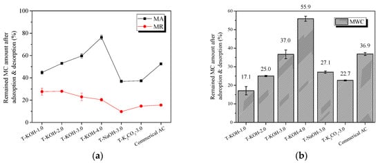 Additionally, the MC adsorption performance of commercial coal-based AC (SBET: 2242 m2/g) was compared with that of tangerine-based AC. The MA and MR values of the commercial AC were 52.5% and 15.6%, respectively, resulting in an MWC value of 36.9%. When considering only the MWC, it was found to be comparable to that of T-KOH-3.0, which exhibited a similar value of 37.0%.