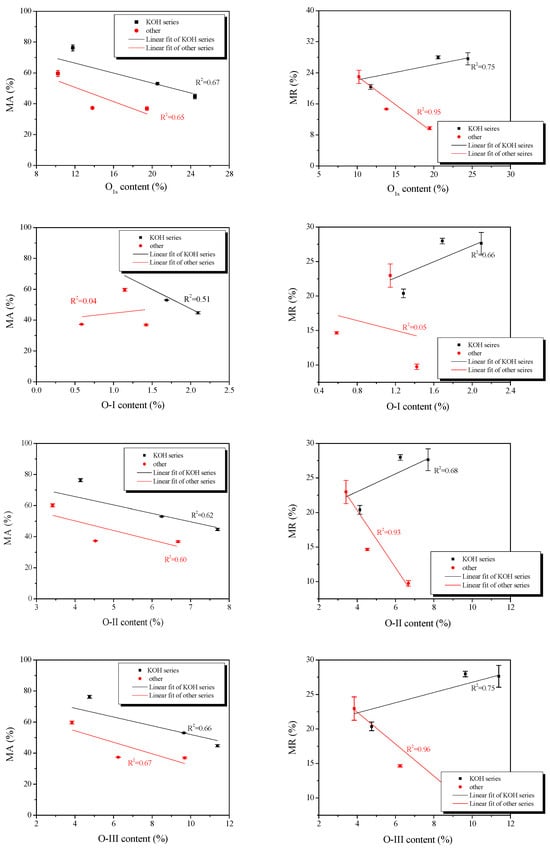 The correlation was more distinct for MR, which indicates desorption performance. Generally, during the desorption process, the binding energy between the adsorbed gas and the oxygen functional groups on the surface of the adsorbent plays a more dominant role than in adsorption.