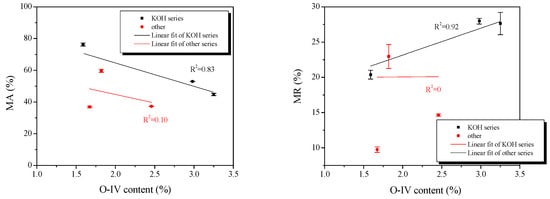 To investigate the relationship between the MA value, which indicates adsorption performance, and the content of oxygen functional groups, the fraction of each peak was considered. According to the results, for KOH-activated samples, the O-IV peak (COOH groups) showed the highest correlation (R2 = 0.83). In contrast, NaOH and K2CO3-activated samples showed a low correlation with all oxygen functional group peaks.