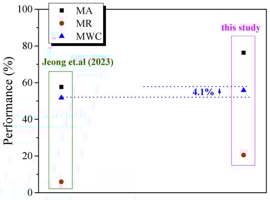 As shown in Figure 10, In the study by Jeong et al. [35], cellulose-based ACF was fabricated and tested for MC adsorption–desorption performance. In contrast, our research focuses on tangerine peel-based AC. From a material perspective, ACF and AC exhibit distinct properties, which explains the higher MR value observed in our study compared to previous research. Additionally, the enhanced pore characteristics of our sample resulted in a higher MA value, ultimately leading to an approximate 4.1% increase in the MWC value.