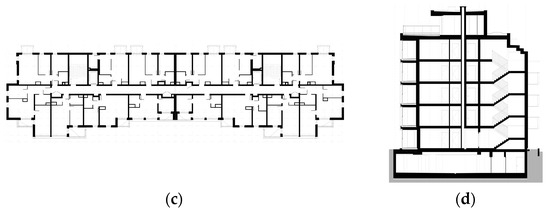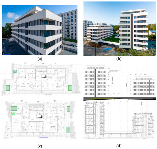 The building at Raginisa Street in Szczecin. (a) Photo of the project implementation. (b) Visualization. (c) Floor plan. (d) Cross section.