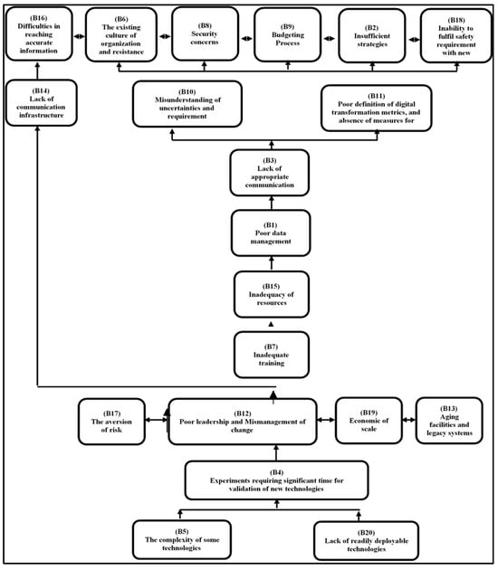 The ISM approach is utilized to analyze the relationships between barriers and develop a structural model of their interactions. It reveals that “Lack of readily deployable technologies” (B20) and “Technical complexities of new technologies” (B5) are the main obstacles to digitalization. Consequently, any new technology requires extensive testing, with “Experiments requiring significant time for validation” (B4) before adoption.