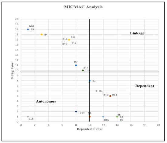 Figure 2 illustrates the categorization of barriers through MICMAC analysis, highlighting their driving and dependent powers. The barrier driving power is calculated as the sum of its own row and the rows it influences in the FRM matrix, while the dependent power is the sum of its column and the columns that influence it. Both powers are displayed alongside the FRM matrix in Table 5.
