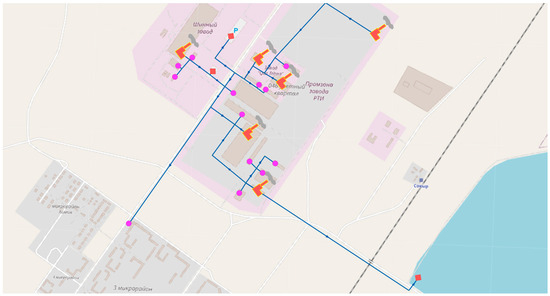 The configuration of a 5GDHC system in the GIS software. The plant sign indicates the position of the source of waste heat. The purple circle stands for the heat consumer. Red squares are balancing nodes (storage + covering peak cooling/heating demands). Шинный завoд refers to KamaTyresKZ, Завoд Qaz Tehna is QazTehna factory, Прoмзoна завoда РТИ and 046 секретный квартал are not anymore relevant as these names referred to the industrial zone during the USSR era.