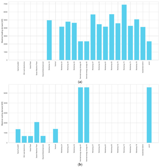 The results of the 5GDHC system simulation: (a) maximal heating demand, (b) maximal cooling demand [kW].