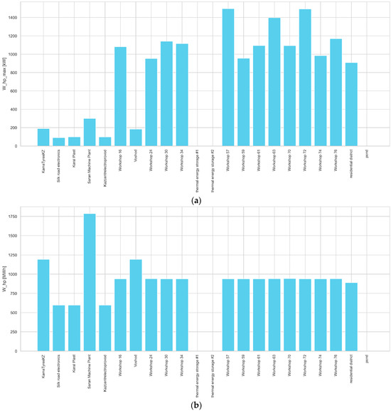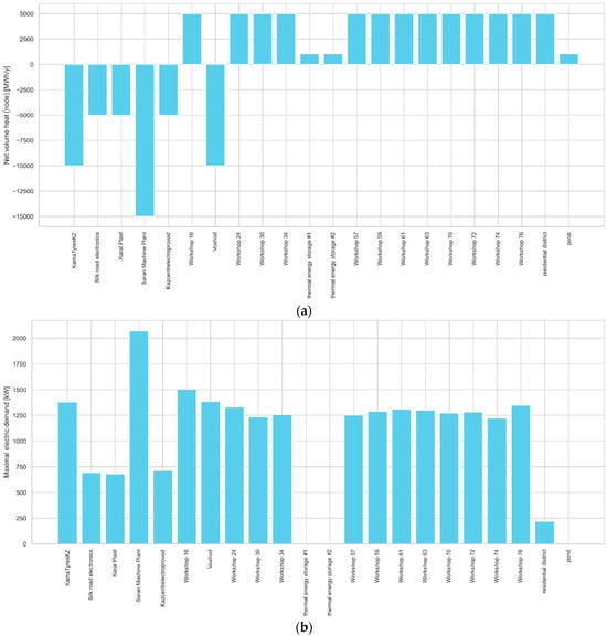 The results of the 5GDHC system simulation: (a) net energy demand [MWh/y], (b) maximal electric demand [kW].