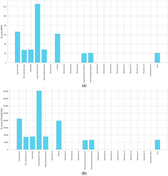 The results of the 5GDHC system simulation: (a) annual electricity consumption of the circulation pumps, (b) associated CO2 emissions.