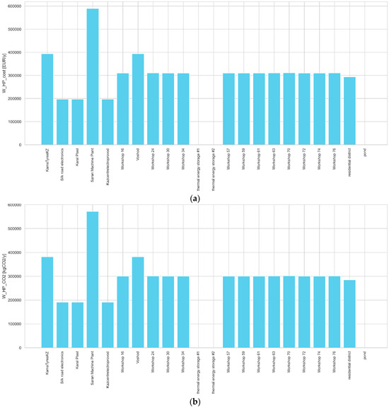 The results of the 5GDHC system simulation: (a) the investment costs of heat pumps annualized over the life span [EUR/y], (b) their CO2 emissions [kgCO2e/y].