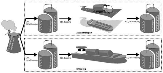 Carbon capture, utilization and storage (CCUS) is a key technology employed to reach the ambitious target of net-zero emissions by 2050 set globally and by the European Union (EU). The deployment target says that 230–430 MtCO2/yr should be captured, transported and stored globally by 2030 [1], but in 2023, this amount was only 50 MtCO2/yr [2]. There are several key steps to overcome the gap: reducing the costs of CCUS, as well as developing clear economic frameworks [3], financing mechanisms, and supporting infrastructure. Intensified efforts have resulted in the development of more efficient capture and storage technologies [4,5,6,7]. However, moving toward practical implementation has unraveled critical aspects related to the long transport distances from inland CO2 emitters to socially acceptable, permanent storage sites. CCUS implementation thus requires the development and deployment of suitable transport solutions. Several studies have highlighted the cost efficiency of pipeline-based transport for a large transport capacity and short to medium distances [8,9,10]. On the other hand, pipeline networks require a long construction time and are not cost-efficient when considering small transport capacities or long distances. Within this context, tank-based solutions (ship, barge, train, truck) can be more appropriate, and are expected to play a key role in both the short- and long-term deployment of CCUS [11,12,13,14]. As a result, more research effort has been placed on different aspects of tank-based solutions, including fundamental modeling [15,16], process and system modeling [17,18,19], techno-economic evaluation [20,21], environmental aspects [22,23,24], contributions to large-scale deployment [25,26], and safety and legal aspects [27,28].