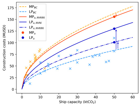 The construction costs as a function of the ship capacity for LP (blue) and MP (orange) ship transport. The dashed lines are the base case (BC) cost curves fitted to the data points (×) from [34]. The values from [34] were adapted to USD 2023 costs by a factor of 1.2648. Filled circles • are the updated (u) construction costs of the LP (dark blue) and MP (red) ships evaluated by the shipping industry. The resulting updated cost curves used in the present study are depicted for MP (red line), (blue line), and (blue dotdashed line). The arrows illustrate the shift in construction costs from [34] to the present study.