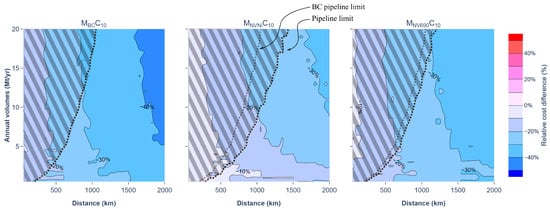 Figure 3 shows the relative costs of LP versus MP shipping for two different cargo tank materials in the LP ships and maximum MP ship capacity at 10 ktCO2. The cost difference between LP and MP is smaller in the present study than in the BC of [32], which is in line with the shift up in LP and down in MP ship costs illustrated in Figure 2. Nevertheless, LP shipping remains less expensive than MP shipping for all annual volumes and transport distances. In the NVNi scenario, cost reduction up to and larger than 20% is achievable in most relevant cases (i.e., where pipeline is not economically preferred).