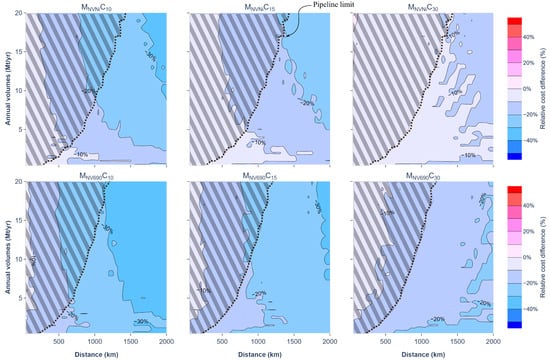 The relative cost difference of LP and MP shipping as a function of transport distance and annual volumes CO2 for (from left to right) 10, 15, and 30 ktCO2/ship in the NVNi (upper) and NV690 (lower) material scenario. The dotted lines show the pipeline cost limit compared to the LP shipping scenario. To the left of the dotted lines are the volume–distance regions, where pipelines are more economic than LP shipping. For clarity, this area is scratched out to highlight that the area is less relevant for shipping.