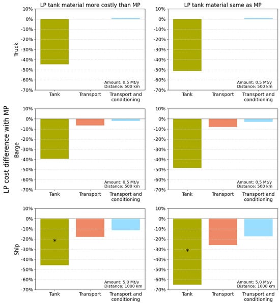 Comparison of relative levelized costs between LP and MP of the tanks, transport without liquefaction and transport with liquefaction for truck (upper), barge (middle) and ship (lower) transport. The comparison is shown for a representative distance and annual volume for inland (0.5 MtCO2 and 500 km) and at sea (5 MtCO2 and 1000 km). Asterisks (*) mark that the ship tank costs are normalized over the tank volume. The maximum ship capacity for LP and MP shipping is 50 ktCO2 and 10 ktCO2.