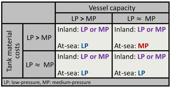 Summary and take-home messages from the inland and at-sea transport assessments. Low-pressure (LP) at-sea transport is more economic than medium-pressure (MP) in all cases except for when the ship capacity is similar for LP and MP (vessel capacity: LP ≈ MP) and the tank material of LP tanks is more expensive than that of MP (tank material: LP > MP). LP and MP inland transport are equivalent in all cases.