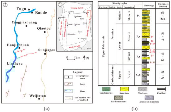 (a) Outline map of Baode Block (the red rectangle show the study area) (from Xu et al. [28]); (b) stratigraphic column of the Paleozoic strata in the Baode Block area (modified from Liu et al. [26]).