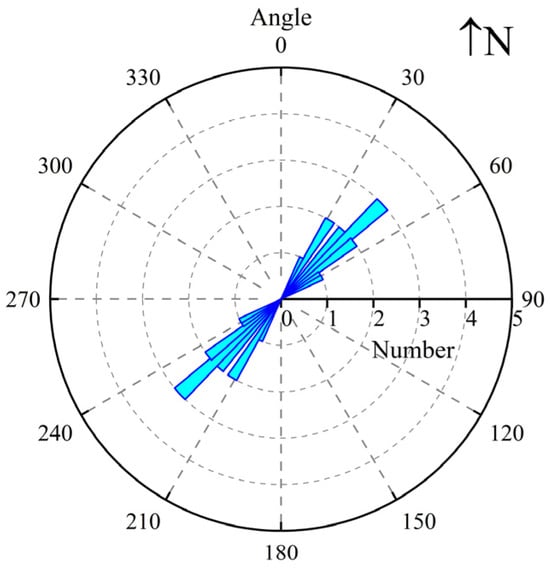 Microseismic monitoring was performed on 12 fractured wells in the Baode area. As shown in Figure 2, the length of artificial fractures primarily ranges from 136 to 226 m, while their height is mainly between 8.5 and 25.3 m, accounting for 75% of the total number of fractures observed. The distribution range of fracture extension observed in microseismic monitoring is primarily concentrated between NE30° and NE64°, with a smaller distribution between NW80° and NW86° (Figure 3). The direction of fracture extension closely aligns with the principal stress direction influenced by the Himalayan structural stress field. Consequently, the dominant orientation of hydraulic fractures in the coal reservoir of the study area is toward the NE direction, indicating a strong modern geostress effect in the region.