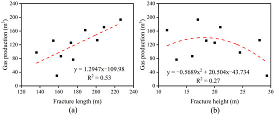 Relationships between gas production and (a) fracture length and (b) fracture height.