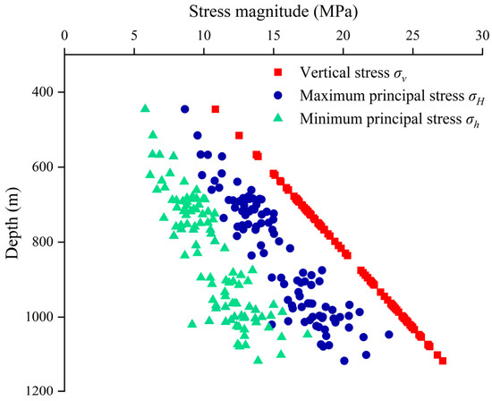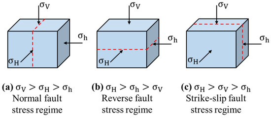 As shown in Figure 7, the values of range from 8.64 to 29.59 MPa, while spans from 5.79 to 21.04 MPa, and σv varies between 10.83 and 38.65 MPa. Wang et al. [46] classified hydraulic fracture patterns into three categories based on the relative magnitudes of , , and : normal fault stress regime, reverse fault stress regime, and strike-slip fault stress regime (Figure 8).