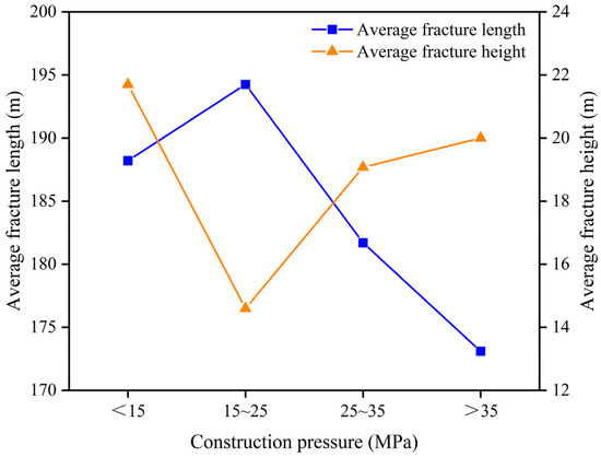 The changes in the construction pressure reflect the process of fracture initiation and propagation. During hydraulic fracturing, the range of fluctuations in construction pressure varies between different CBM wells due to differences in geological conditions. As shown in Figure 10, the construction pressure ranges of the fractured wells in the study area show a statistical correlation with their fracturing characteristics. The results indicate that wells with construction pressures between 15 and 25 MPa tend to have longer average fracture lengths and lower average heights. As the construction pressure increases, the fractures progressively become wider but shorter in height.