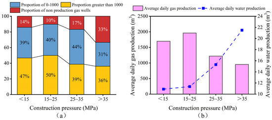Moreover, we analyzed the coalbed methane production under different construction pressure ranges, categorizing the stable daily gas production of the coalbed methane wells into three groups: 0–1000 m3, greater than 1000 m3, and wells with no production. The statistical results (Figure 11) indicate that the CBM wells operating at construction pressures between 15 and 25 MPa achieve the highest gas yields, with the lowest proportion of non-producing wells. In contrast, when the construction pressure exceeds 35 MPa, the daily gas production drops significantly. These findings suggest that CBM wells subjected to construction pressures in the 15–25 MPa range generate longer fractures with reduced heights, leading to improved gas production. However, during the hydraulic fracturing process, construction pressure can be actively controlled through human intervention.