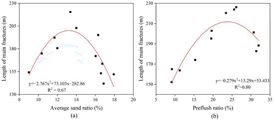 Relationships between fracture length and (a) average sand ratio; (b) preflush ratio.