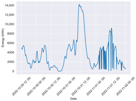 The data preprocessing was done in six steps. First, the data were roughly cleaned to eliminate measures differing from the general range of values by a magnitude. Observations with values greater than the general range of the given variable were eliminated. This allowed for further plot-based analyses without extreme outliers extending the plots and statistics of data. This allowed the data from years 2023–2024 to be discarded due to radical changes in the observed electricity generation range. Additionally, sudden atypical drops of energy generation values were spotted. The phenomena started appearing at the beginning of November 2022 and lasted until the end of the year. The moment of change of the described behavior is shown in Figure 1.