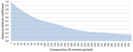 The processed data after the preprocessing phase covers the period from 1 January 2021 to 31 December 2022. In the first step, an analysis was conducted to verify which lagged values of the forecasted time series of electricity generation could potentially serve as valuable input data for the predictive models. For this purpose, Pearson’s linear autocorrelation values for the electricity generation time series up to 60 h back (360 lagged 10-min intervals) were calculated. Figure 2 shows the autocorrelation function (ACF) of electricity generation from the wind farm. The first 12 ACF values were above 0.9, indicating a very strong correlation.