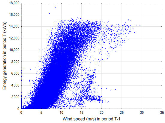 Figure 3, on the other hand, presents a scatter plot between energy generation in period T and wind speed in period T − 1. The relationship between energy generation and wind speed was nonlinear. Moreover, there was a noticeable amount of scatter in the plot, which may indicate that wind speed (lagged values) may not be as significant as input data compared to the lagged values of energy generation. The Pearson linear correlation coefficient between energy generation in period T and wind speed in period T − 1 was 0.9525, which was close to the correlation between energy generation in period T and energy generation in period T − 6, which was 0.9515. The last 6 lagged values of wind speed were selected as input data. The first lagged value had a correlation of 0.9525, while the sixth lagged value had a correlation of 0.8249. This represented the variant with the largest number of input data points.