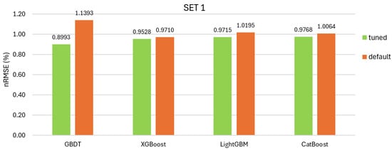 Comparison of the nRMSE error on the test range for four models using the SET1 dataset, with default hyperparameters and tuned hyperparameters.