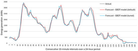It is worth noting that, although the GBDT model achieved the lowest forecast errors for energy generation, it required a very long training time to identify the optimal hyperparameter values. For example, for the SET1 input dataset, the total training time was more than 220 times longer than that of the model with the shortest total training time, amounting to over 22 days, which presented a significant practical issue when the time available for hyperparameter tuning was limited. In contrast, the model with the shortest hyperparameter tuning time, LightGBM, required just over 2 h to search through a similar number of hyperparameter combinations.