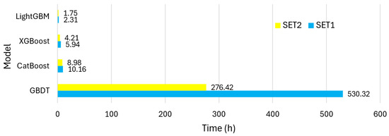 Analyzing the training time of the models with default settings, it can be observed that for both data variants, SET1 and SET2, the order of the models was identical: LightGBM was by far the fastest to train, followed by CatBoost, while GBDT was the slowest (with training time being several times longer compared to the fastest model). For the SET1 dataset, the training time of the models was longer than for the SET2 dataset, which was expected due to the significantly smaller number of input data in SET2. The exception was the LightGBM model. The most substantial reduction in training time for SET2 occurred with the GBDT model. For the remaining three models, the impact of the number of input data on training time was much smaller.