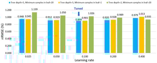 Figure 10 presents a segment of the tuning process for three hyperparameters of the GBDT model for the SET1 input data variant. A clear influence of the learning rate on the nRMSE error was visible. The default value proved to be appropriate for the GBDT model, as both increasing and decreasing the learning rate led to a rise in nRMSE error. Conversely, the hyperparameter “minimum samples in leaf” had a very minimal impact on the nRMSE error—both a value of 20 and the default value of 1 were appropriate. Noteworthy, however, was the significant effect of the “tree depth” hyperparameter. A depth of 5 was more advantageous than values of 2 or 3 (default).