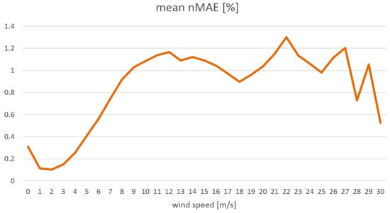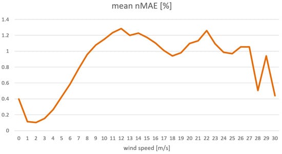The influence of weather conditions on the quality of forecasts was investigated for the best GBDT model using SET1 input data. Figure 11 and Figure 12 show the calculated mean error nMAE for individual wind speed ranges. As can be seen, the mean error increased and reached a maximum at average wind speeds. For such values, the power production curve for turbines had the greatest slope. Then the errors decreased and increased again for wind values at which we deal with violent weather phenomena, which may result in wind turbines switching off.