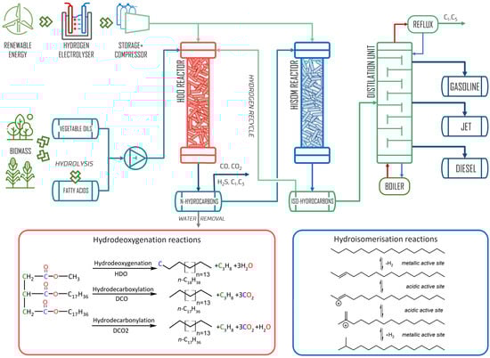 In the hydroisomerization reaction, bifunctional catalysts are employed, operating through a mechanism in which alkylcarbenium ions are intermediate products (Figure 2). These alkylcarbenium ions are formed via the dehydrogenation of the alkane on a noble metal, followed by the protonation of the alkene on a Brønsted acid site. In this process, noble metal catalysts such as Pt [19] or Pd [20], supported on synthetic zeolites like ZSM-5, SAPO-11, or MCM-41, are utilized. A typical schematic of the two-step technology for producing aviation bio-additives is presented in Figure 2.