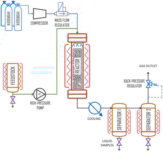 The hydrodeoxygenation process for crude soybean oil was conducted in a high-pressure flow reactor system with a stationary bed of 200 cm3 catalyst. The system setup is illustrated in Figure 3. It also includes a raw material tank, a high-pressure pump (Leva, Warszawa, Poland), a hydrogen mass flow regulator (Bronkhorst, AK Ruurlo, The Netherlands), and a pressure regulator (Swagelok, Wrocław, Poland). The hydrodeoxygenation reactions were carried out in temperatures ranging from 220 to 340 °C, pressure from 2 to 10 MPa, and LHSV (0.25 to 1) at a GHSV of 600. A commercially available nickel catalyst on silica-alumina support was used. The catalyst is dedicated to sulfur-free conditions and was supplied in the form of extrudates with a diameter of ~2 mm. The obtained n-alkanes were evaluated via GC method, using a PerkinElmer Clarus 500 instrument (Shelton, CT, USA) equipped with a flame ionization detector and a nonpolar capillary column DB-1 (60 m × 0.32 mm × 0.5 µm), and GC/MS method using the Gas Chromatograph 7890A GC System by Agilent Technologies (Santa Clara, CA, USA) equipped with the MSD type 5977B mass detector and a computer station with Mass Hunter software version 10.1.49.0.