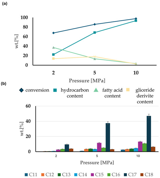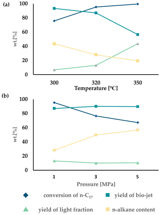 In conclusion, higher pressure improves the bio-jet yield, although it reduces the conversion of n-C17, demonstrating the trade-off between conversion efficiency and product selectivity under varying pressure conditions.