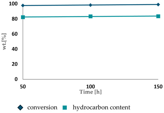 The catalyst stability tests (Figure 6) did not reveal a significant loss of activity in time during continuous operation over 150 h. The organic fraction during the test contained a stable amount of 97.8 ± 0.4% wt. of hydrocarbons, and the overall triglyceride conversion was ~100%. The HDO fraction does not contain any multiple bonds, as the iodine value has changed from 127.40 to 0.78. Based on the GC-MS analysis (Figure 7) of the produced feedstock, it can be concluded that 2% of free fatty acids and mono- and diglycerides are present, while the majority of the composition consists of saturated hydrocarbons. The presence of trace amounts of oxygenated compounds does not interfere with the hydroisomerization process, as the 0.5% Pt/Al2O3 + SAPO-11 + 3% PEG-4 catalyst is also capable of deoxygenating the n-alkane fraction without directly affecting the product, since the resulting water is removed in the light fraction distillation process.