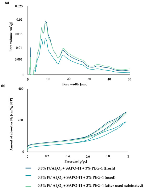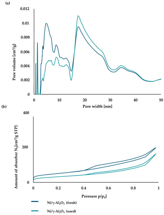 After the catalyst stability test, surface studies were conducted to evaluate changes in pore structure and specific surface area by comparing the results with the fresh catalyst. The results of the nitrogen sorption analysis at −196.15 °C, including BET surface area, pore volume, and pore size distribution, are presented in Figure 8 and Table 3.
