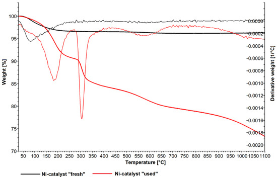 Based on Figure 8, the nickel catalyst can be classified as a material with type III adsorption isotherm and H3 hysteresis, suggesting a micro–mesoporous structure. Hysteresis H3 indicates the presence of plate-like or irregular pores, which may affect the adsorption characteristics [34]. Thermogravimetric analysis confirmed the presence of coke, but its quantitative determination is challenging due to overlapping oxidation peaks of nickel present in the catalyst in a partially reduced form. Figure 9 shows the TG and DTG curves for fresh and used nickel catalyst samples in a nitrogen atmosphere. Nevertheless, physicochemical studies indicate that coke formation is likely not permanently detrimental to the catalyst, as the decrease in surface area and pore volume after testing (as shown by SBET and VT values) does not correspond to a significant loss of catalytic activity. This suggests that the coke may be forming in non-critical regions or in the larger pores, leaving the active sites largely unaffected. Additionally, the unchanged average (La) and median (Lm) pore lengths further support the hypothesis that the structural integrity of the catalyst is maintained, and any deposited coke is either weakly bound or easily removed under reaction conditions, preventing significant deactivation.