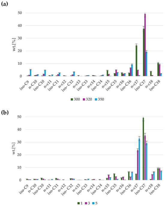 At a reaction temperature of 340 °C, the yield of n-alkanes (Σn-C14–C18) reached a maximum value of 82.4%. Higher temperatures also led to an increase in iso-alkane content due to the intensification of cracking reactions due to the skeletal rearrangement of hydrocarbons into lighter fractions. Similar findings were reported by Verma et al. [31], who found that increasing the temperature (375–450 °C) promoted the cracking of hydrocarbons within the naphtha range (425 °C), confirming an enhancement in cracking reactions and increased selectivity for isomerization.