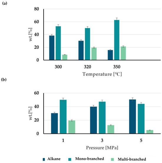 Based on Figure 11a, it can be observed that, as temperature increases, the concentration of n-C15 to n-C18 hydrocarbons in the product decreases, while the concentration of C9 to C14 hydrocarbons increases, due to cracking reactions. The cracking process predominantly occurs at the middle of long hydrocarbon chains, resulting in higher concentrations of C9 and C10 in the cracked products, a finding consistent with the results reported by Lin et al. [37]. According to the data shown in Figure 12a, both mono-branched and poly-branched hydrocarbons increase with temperature. At 350 °C, the highest concentrations of both mono- and multi-branched hydrocarbons are observed, corresponding with the lowest content of n-alkanes.