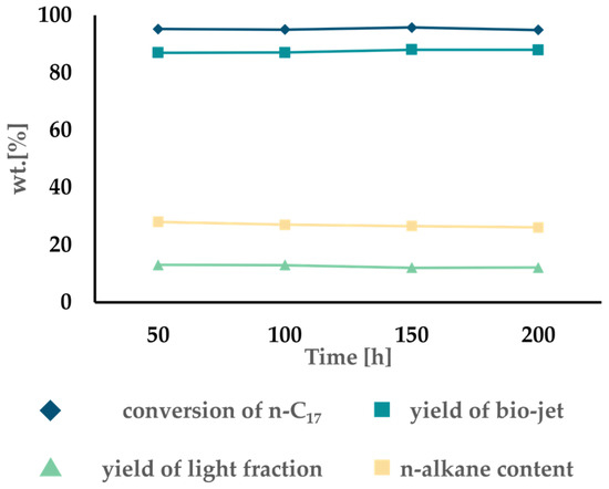 The stability tests of the 0.5% Pt/Al2O3 + SAPO-11 + 3% PEG-4 catalyst did not reveal significant changes in its performance, both in terms of process parameters and product composition, during continuous operation over 200 h. A bio-jet fraction yield of 87.5 ± 1.6% was achieved, while the yield of the light fraction was 12.5 ± 0.5%. These results indicate no signs of increased cracking, which could have been attributed to the leaching of the metallic phase of the catalyst, a fact that was further confirmed via ICP-OES analysis.