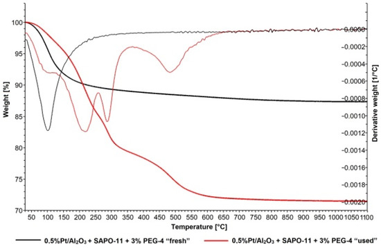 To confirm the presence of coke, thermogravimetric analysis (TGA) was conducted for both fresh and used 0.5% Pt/Al2O3 + SAPO-11 + 3% PEG-4 catalysts (Figure 15). During the heating of the fresh catalyst, a significant one-step mass loss was observed, primarily related to the release of volatile components, including water evaporation. In contrast, for the used catalyst sample, within the temperature range from 30 °C to approximately 380 °C, three overlapping weight loss stages were observed, corresponding to the evaporation/boiling of volatile components and the thermo-oxidative decomposition of organic compounds from the synthesis process. Above 400 °C, a significant weight loss occurred due to the thermo-oxidative decomposition of the “coked” post-reaction residue.