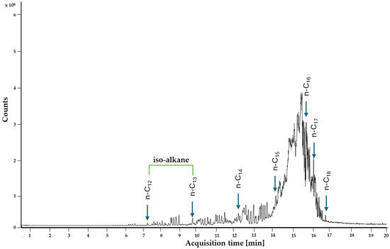 To obtain the final bio-component for Jet-A1 aviation fuel, the distillation process has to be carried out. The hydroisomerization product, after a 200 h stability test, was subjected to fractional distillation to remove light n-alkanes and iso-alkanes. These compounds negatively impact the fuel properties by lowering the autoignition temperature, which has significant safety implications for aviation fuel use. Additionally, their presence affects other physicochemical parameters, such as viscosity and fuel density. The distillation was conducted within a temperature range of [30–180 °C], and the composition of the obtained distillate was evaluated using Gas Chromatography–Mass Spectrometry (Figure 16).