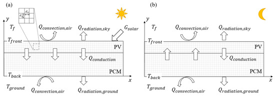 - The natural convection inside the PCM is neglected. Only its conductive heat transfer is considered because the PCM is closely attached to the PV panel, and its internal state is stable [51].
