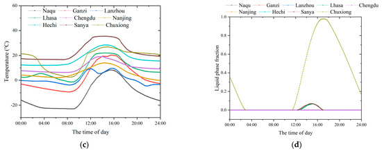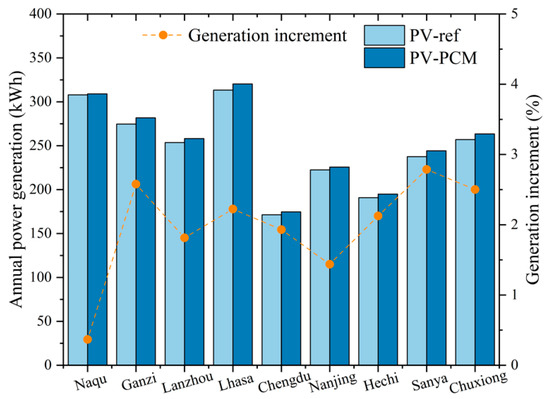 - In extremely cold regions such as Naqu, PCM is basically ineffective in regulating temperature and its annual power generation is only increased by 0.5%. Conversely, for the other regions investigated in this paper, the utilization of PCM can enhance annual power generation, with improvements ranging from 1.4% to 3%. In summary, the increase in annual power generation is more substantial in regions characterized by high average annual temperatures and abundant solar resources, as well as in areas with high summer temperatures and ample solar resources.